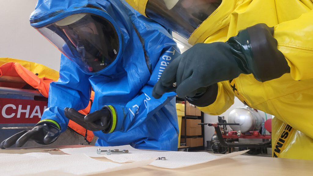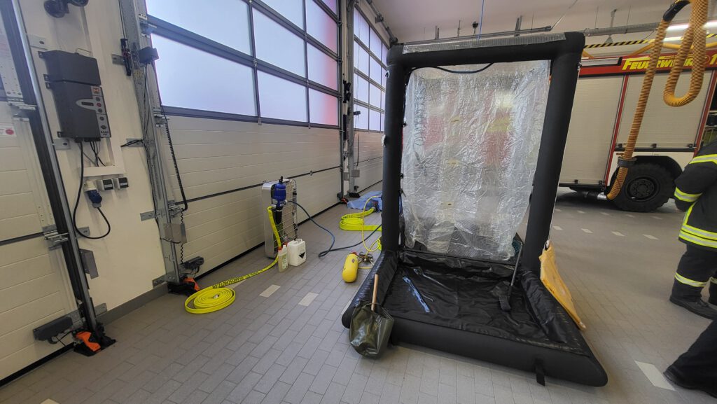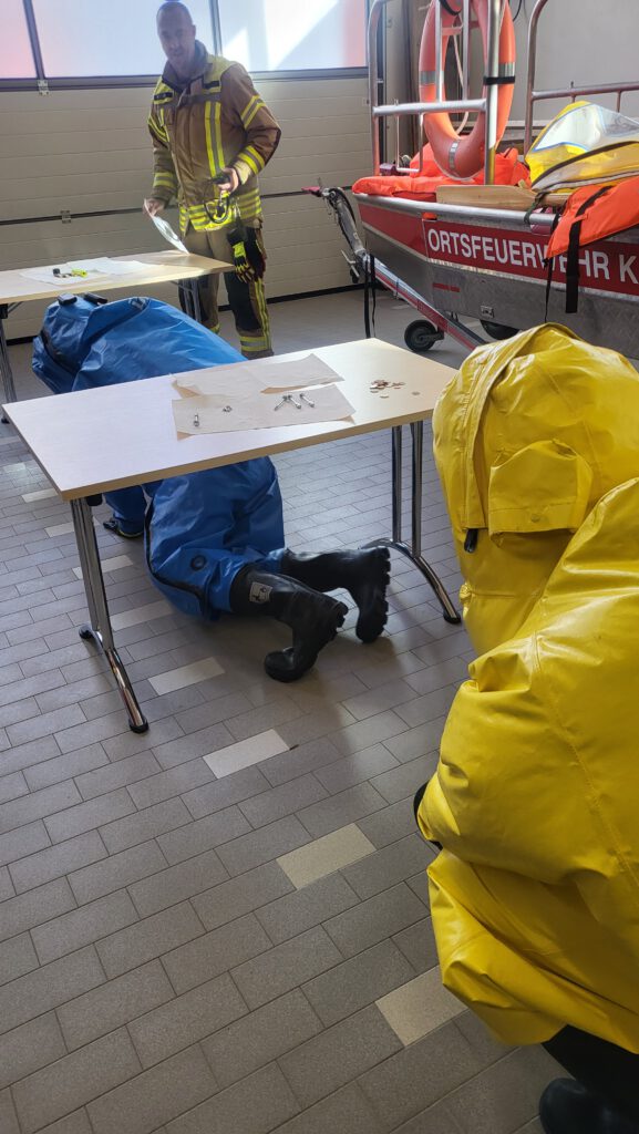 Im Rahmen der Ausbildung absolvierten vier Kameraden ihre jährliche Gewöhnungsübung im gasdichten Chemikalienschutzanzug. Darüber hinaus wurde die Dekontaminationsstrecke des GW-S aufgebaut und dessen Ausstattung und Einsatzoptionen näher erläutert.