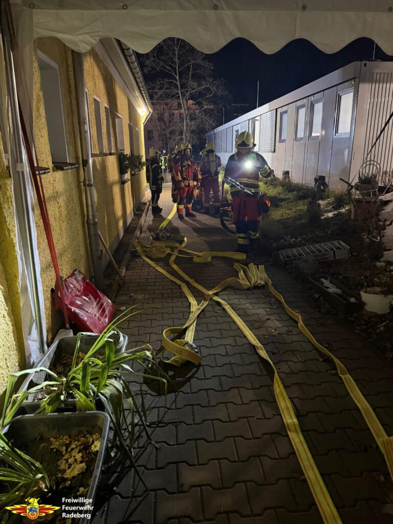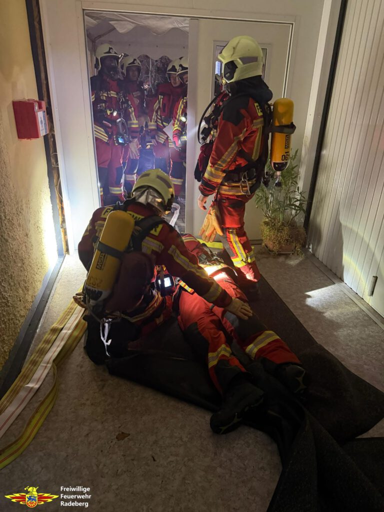 Die Ortsfeuerwehr Radeberg hatte zum letzten Ausbildungsdienst als Übungsschwerpunkt die FwDV 3. Dafür wurde eine Einsatzübung in der Evangelischen Gemeinschaftsschule Radeberger Land durchgeführt. Als Übungslage galt ein Gebäudebrand mit zwei vermissten Personen. Mehrere Trupps gingen unter Atemschutz zur Menschenrettung und Brandbekämpfung vor. Die Vermissten konnten zügig aufgefunden und ins Freie gebracht werden. Kurz darauf wurde auch der Brand in einem Klassenzimmer lokalisiert und erfolgreich bekämpft. Im weiteren Verlauf kam es zu einem Atemschutznotfall, bei dem ein Trupp in Schwierigkeiten geriet. Der bereitstehende Sicherheitstrupp konnte den verunfallten Trupp jedoch rasch retten und in Sicherheit bringen.